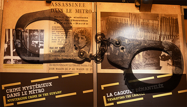 Pour fêter ses 100 ans, la PJ a ouvert ses boîtes d’archives et sorti des documents variés: notes, PV d’audition, photos, articles de presse, mais aussi télévisuels afin de nous permettre de mieux appréhender les faits. Nous voici au cœur des affaires : l’assassinat de Jaurès, Landru, Violette Nozière, le gang des postiches, les attentats, enlèvements, trafics ; les ennemis publics : Guy Georges, Thierry Paulin, Jacques Mesrine, Lucien Léger. La scénographie souligne au fur et à mesure les progrès techniques et scientifiques : photographie signalétique, empreintes, fichier central …