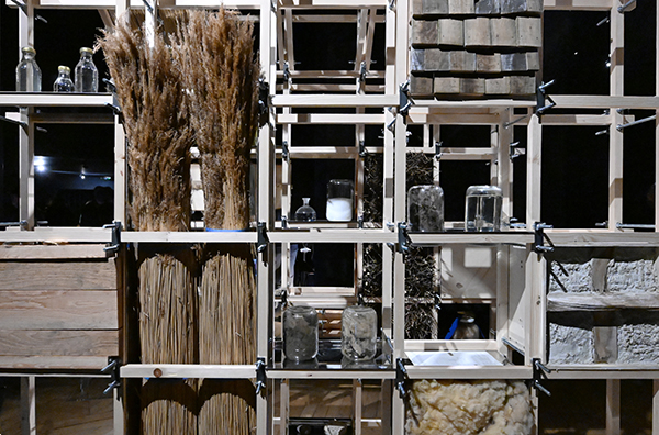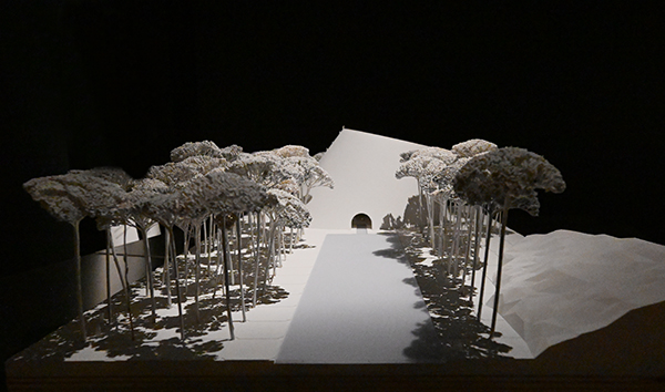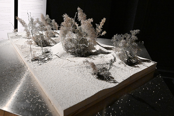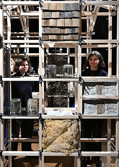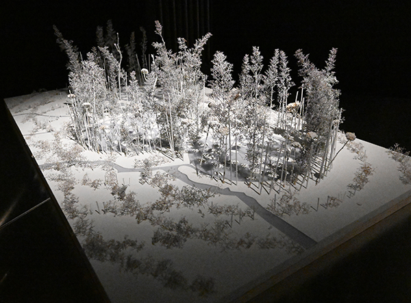 Les maquettes qu’il présente « explorent les trajectoires de plusieurs agents : la brume, le plancton, l’eau verte, les spores et les poussières, l’azote et le carbone, les thermodynamiques… à l’exemple de l’étude qu’il avait menée à Rome sur les interactions entre les paysages de la métropole latine et l’atmosphère (Villa Médicis – Académie de France) »