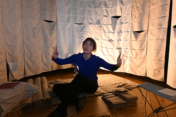 A propos d’architecture nomade en choisissant le lin, elle nous montre comment : « habiter notre planète avec des ressources limitées, comme autant de dispositifs répondant aux aléas climatiques. Tentes, tapis, teintures, tapisseries, sacs de couchages, autant d’architectures souples répondant aux contraintes climatiques, tout en étant capables de se plier, déplier, replier (…) Plus ou moins proche du corps, le textile peut devenir habit ou habitat. »