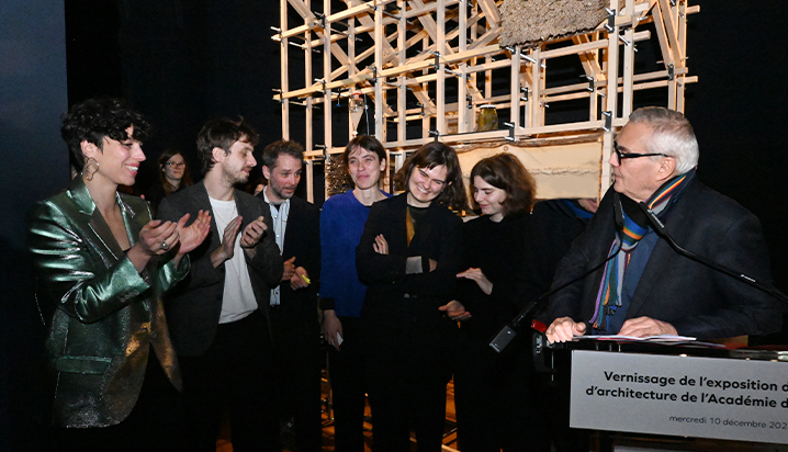La photo d’ouverture de l’article réunit les lauréats, les membres du comité d’organisation, la directrice du service de la communication et des prix de l’Académie des beaux-arts, ainsi que des membres du jury de la section architecture, Marc Barani, Jean-Michel Wilmotte, tous réunis autour de l’Académicien Dominique Perrault.