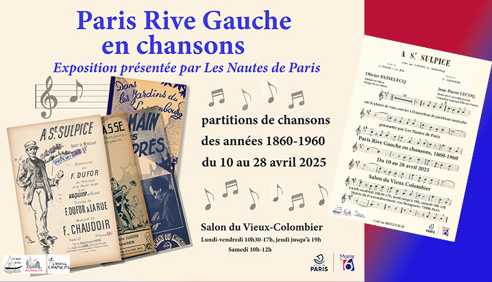 Les Nautes de Paris vont raconter : Paris Rive Gauche avec les illustrations des partitions de chansons. Une exposition organisée avec le concours de nos amis, Thierry président de l’Acagl14 et de la Facap, Agnès du Temps des chansons, Joël et Sylvie. Vous pourrez aussi y découvrir des photos de Dominique et des dessins d’André.