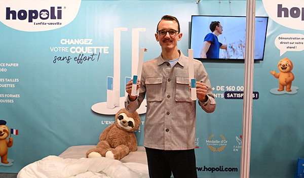 Le concept : « Vous suspendez deux pinces en acier à une porte, puis grâce à quelques gestes simples vous enfilez une housse sur sa couette sans faire aucun effort physique. » Démonstration sur place. Ce Serial inventeur, comme il se définit, présente un poster à gratter pour se remémorer 100 choses faites dans notre vie (les illustrations sont de son épouse), 50 choses à faire à la retraite, en couple ou encore 50 événements de la vie de bébé…