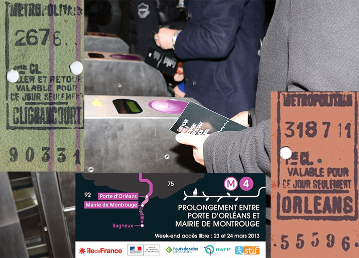 La ligne de métro Clignancourt – Orléans a pour terminus Mairie de Montrouge, depuis le 23 mars et sans doute jusqu’en 2019, date à laquelle la ligne 4 devrait arriver à Bagneux. Ci-dessus, ticket Aller-Retour Clignancourt, 1926 ; aller simple 1ère classe Orléans, 1927 ; 86 ans se sont écoulés entre ce voyage en 1ère classe et l’utilisation du billet inaugural, le samedi 23 mars 2013, à la station Mairie de Montrouge.