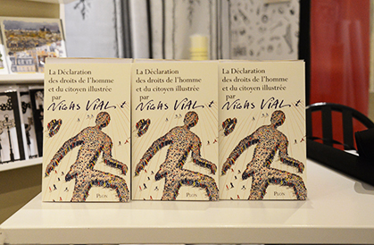 Lors de l’inauguration de la nouvelle librairie-boutique Arteum du Musée Carnavalet-Histoire de Paris, 23 rue de Sévigné (Paris 3e), le 9 décembre dernier, on pouvait découvrir des dessins du peintre et dessinateur de presse Nicolas Vial. Ces dessins sont ceux de son livre « La Déclaration des droits de l’homme et du citoyen illustrée » (publié chez Plon), une approche critique en forme d’interrogation qui en ce lieu fait écho aux salles de la période révolutionnaire du Musée… la première exposition.