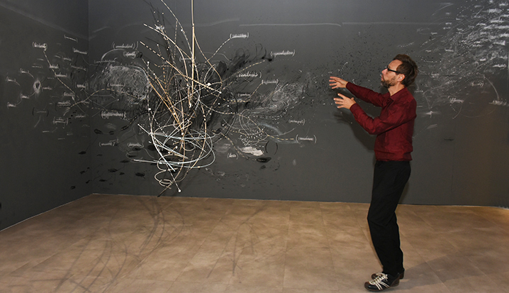 Les diagrammes sont un de ses sujets d’étude favori. Il a tracé à la craie sur un mur de la salle devenu tableau noir, un diagramme, une représentation graphique de déroulement et de variations de pensées. Constitué de signes, de traces, de mots en partie effacés, toutes les lignes ont été projetées et sont devenues un dessin mobile, un mobile dessiné, une sculpture tracée, un réseau de lignes et de points qui se meut dans l’espace et concrétise un diagramme d’instant de vie. Il donne à ce type de réalisation éphémère le nom de « dessin élargi ». Tout disparaîtra à la fin de l’exposition. Effacé le mur, démonté le mobile qui flotte actuellement.