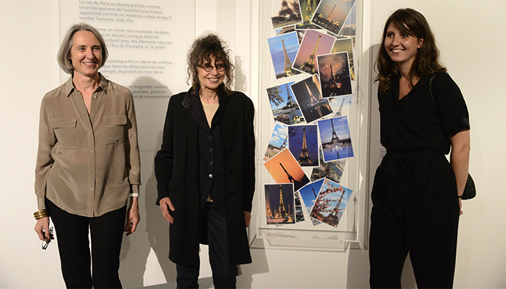 ci-dessus Anne Cartier-Bresson en compagnie des photographes Mathilde Geldhof et Dolorès Marat devant la création de Hans-Peter Feldmann « Tour Eiffel » ; vingt-quatre impressions électrophotographiques d’après des cartes postales… de la Tour Eiffel.