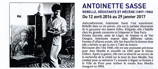 L’exposition « Antoinette Sasse. Rebelle, Résistante et mécène 1897-1986 » présentée du 12 avril 2016 au 29 janvier 2017 au Musée du général Leclerc de Hautecloque et de la Libération de Paris – Musée Jean Moulin – Paris Musées (Paris XVe) est consacrée à l’artiste, la femme libre anticonformiste et à la Résistante dans un parcours chronologique. Mariée en 1920 à Raymond Sachs, fils du compositeur Léo Sachs, elle divorce en 1933. Moderne, elle a son permis de conduire. Elle pilote des avions. Sportive, elle fait du ski, de la natation.
