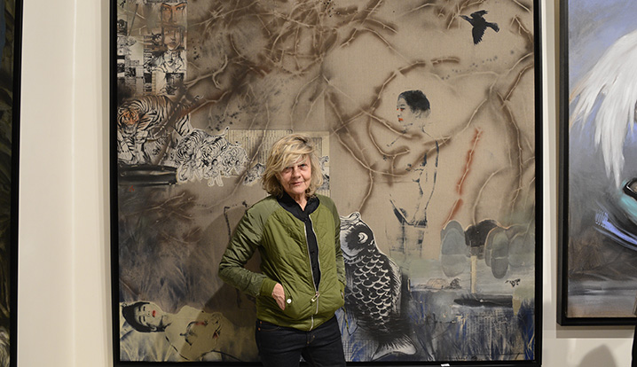 « L’art est une petite fille qui joue, dit-elle, sous le regard des Amazones qui gardent leur côté animal… Je suis, dans le tableau, cette Amazone. Chen Jiang Hong a dessiné des tigres, soulignant mon côté animal ; je suis de l’année du tigre. Mais, mon personnage est aussi une sorcière, Vénus de Boticelli entourée de corbeaux. Les corbeaux m’accompagnent; c’est ma signature, ajoute-t-elle, j’en mets dans toutes mes toiles ; ici, il n’y en a qu’un.»