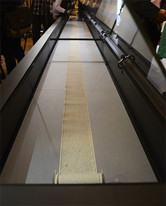 Emprisonné a diverses reprises, le libertin, le débauché, l’écrivain Donatien Alphonse François de Sade cumule plus de 26 ans d’incarcération. Lors de son séjour à la Bastille en 1785, il va entreprendre de recopier d’une écriture minuscule, Les 120 journées de Sodome ou l’école du libertinage sur 33 feuillets recto verso qui réunis bout à bout formeront un rouleau de 11,2 cm x 12 mètres de long. Le texte sera mis dans un étui de cuir qu’il va garder caché entre les pierres de sa cellule.