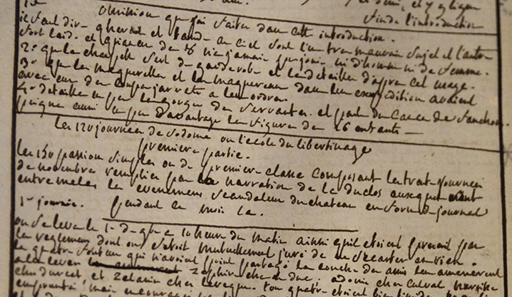 Pour les deux cents ans de la mort du divin Marquis, le manuscrit hors norme, le roman sulfureux à nul autre pareil  : Les 120 journées de Sodome qui était en Suisse a fait son retour en France, le 25 mars dernier, après plus de trente ans de procédures et de querelles juridiques. Le Musée des Lettres et Manuscrits (Paris) le présentera au public, en septembre prochain.