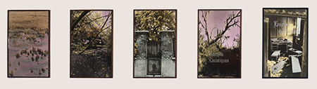 Les tapisseries de la Tenture du Monde dialoguent avec la série de photos N&B colorées avec texte sérigraphie : Epaves du désir, 1995 de Martine Aballéa. (Collection Frac Basse-Normandie, Caen)