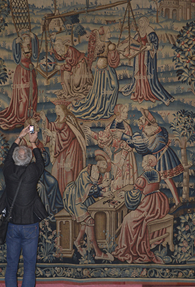 Cette tapisserie appartient à une série de trois tapisseries : La Vanité trônant sur son char, Le Monde ne tient qu’à un fil et ici Le Monde mis en balance qui composent la Tenture du Monde. (Vers 1520-1530. Collection Les Arts décoratifs, Paris)