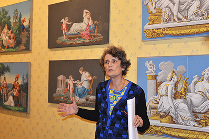 Véronique de La Hougue a sélectionné une série de papiers peints camées, mis en couleur à la planche. Ils étaient placés en attique, au-dessus des portes, voire devant les cheminées et sur des paravents, afin de compléter les décors de papiers peints panoramiques (paysages historiés) qui se sont développés en France au XVIIIe siècle.