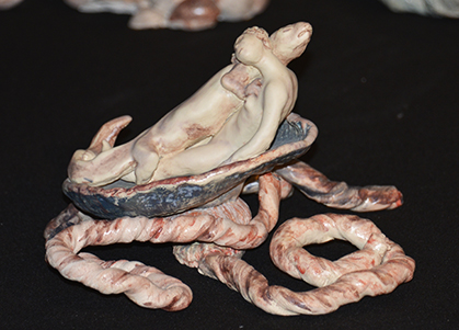 Une des faïences émaillées de la série « Passage » de Laurie Karp dialoguant avec les métamorphoses d’Ovide.