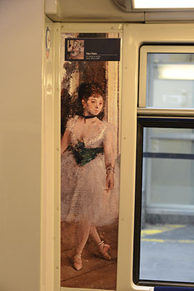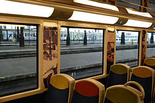 Les portes avec les poignées, les gongs, les serrures, les voyants, les bombés, les descentes d’escalier, les recoins, les panneaux étroits ont été autant de difficultés à surmonter, de pièges à contourner. Un travail soigné, un ajustage au millimètre près, réalisé par la même équipe qui l’an passé avait habillé le RER C de Versailles. (photos : Dominique Germond)