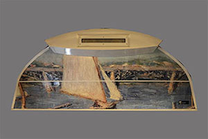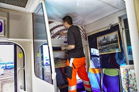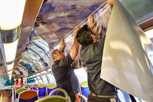 Les membres de l’équipe technique de la SNCF (ci-dessus) qui ont travaillé durant une semaine sur la mise en place des scènes choisies par l’équipe artistique ont du tenir une cadence soutenue pour observer les délais qui leur étaient fixés. Difficile en amont de bien appréhender les défauts de courbures et les découpes qu’il a fallu ajuster parfois de manière acrobatique dans des laizes calculées au plus juste.