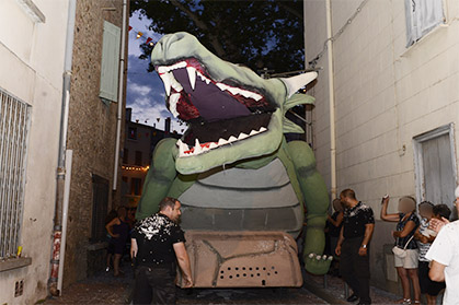 L'énorme Babau se glisse avec difficulté dans les rues étroites.